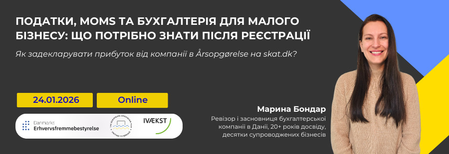 Спікерка: Марина Бондар - ревізор із понад 20-річним досвідом у сфері фінансів та обліку, з яких 10 років — у Данії, а до цього 10 років — в українських та міжнародних компаніях. Засновниця компанії, що спеціалізується на бухгалтерському супроводі малого та середнього бізнесу в Данії. Має глибоку практичну експертизу у веденні бухгалтерського обліку, підготовці звітності та податкових питаннях. Супроводжувала десятки підприємців при реєстрації, закритті компаній та під час податкових та аудиторських перевірок.